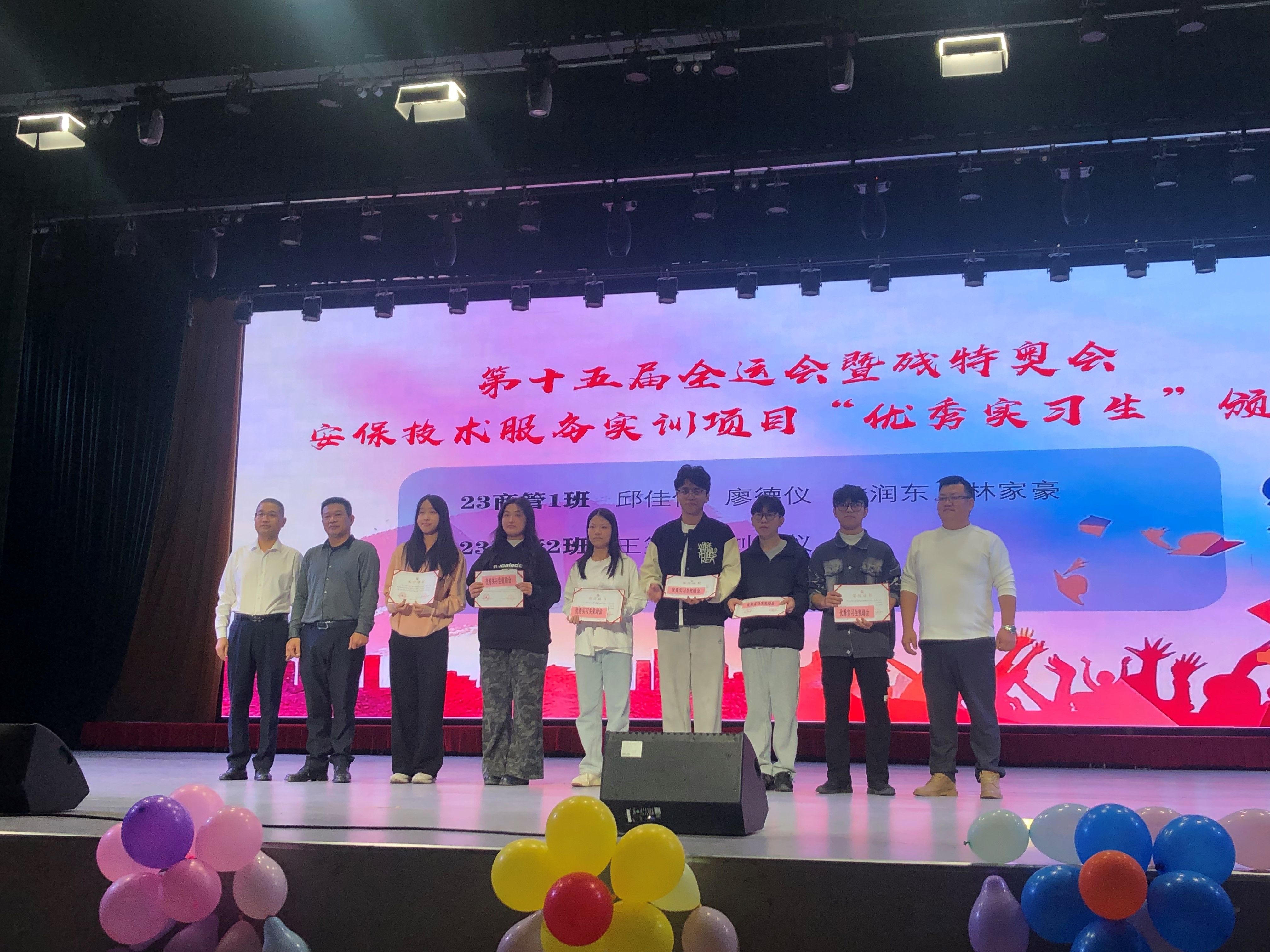 12月18日,工商学院举办十五运会和残特奥会安保技术服务颁奖仪式。学校党委委员、副校长唐毓秋,组委会安保服务承接单位广东卫安保安服务有限公司总经理周建国以及广东中保顺威保安服务有限公司董事长贺靖受邀出席颁奖仪式并一同给优秀实习生颁发了荣誉证书。颁奖仪式上,周建国代表企业作了讲话,高度肯定了所有参加安保技术服务的同学们,号召同学们以安保技术服务实训为起点,积极拥抱未来,勇于挑战、勇敢前进,为广东工贸续写新的篇章。