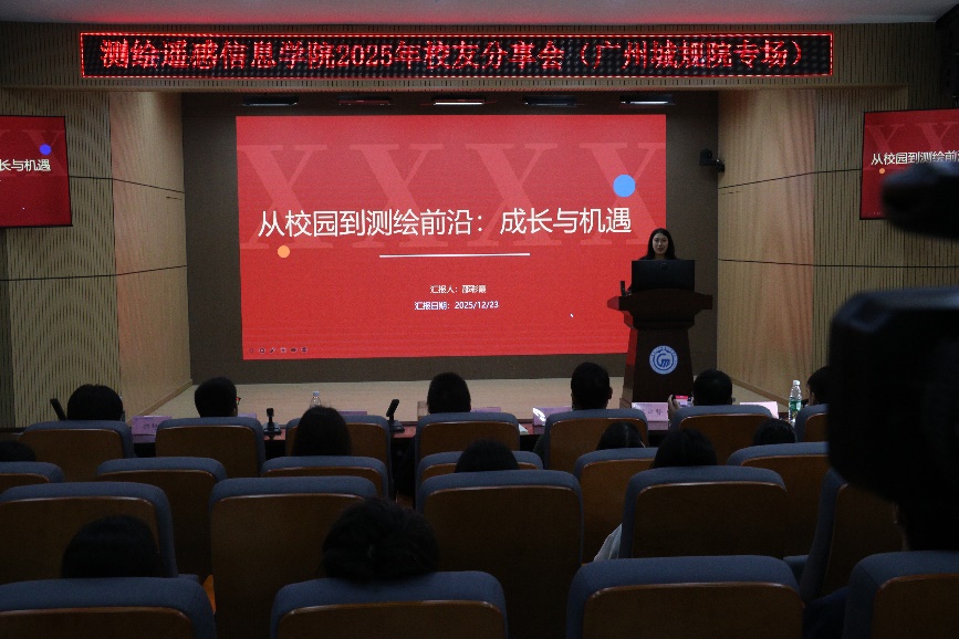 为帮助同学们明晰职业发展规划,破解实习选择与职业规划的迷茫,搭建在校生与校友前辈的交流桥梁,12月23日下午,测绘遥感信息学院在图书馆5楼报告厅举办“薪火相传、职场扬帆”校友分享会。院长高照忠出席并致开场词,广州市城市规划勘测设计研究院校友池维权、苏中贤、李冠鹏、邵彩霞、陈震华以及2023级实习生苏瑾漪受邀主讲,师生代表参加了此次活动。