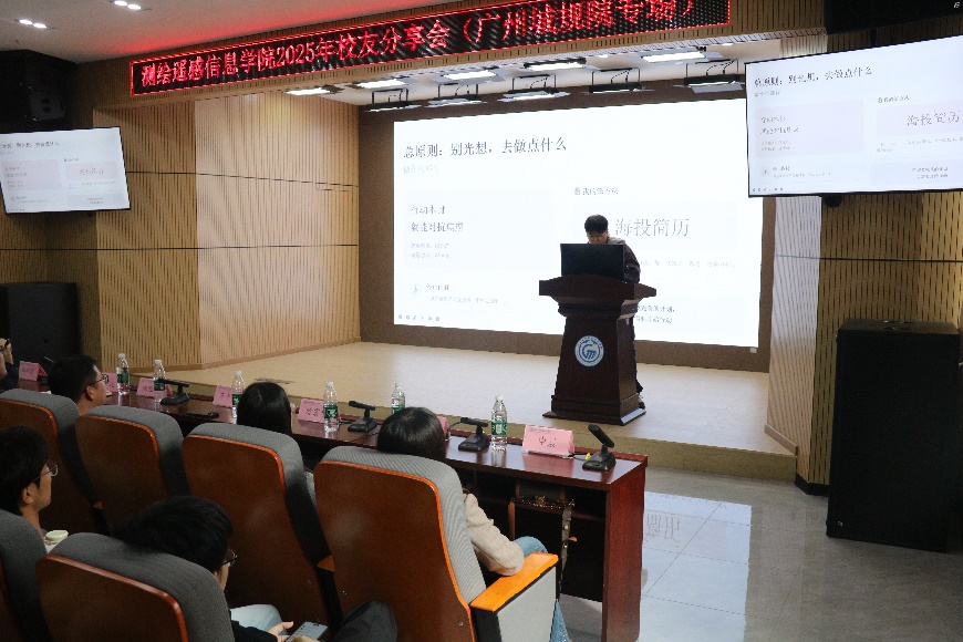 2022级土管专业校友陈震华,毕业后入职广州市城规院白云分院担任数据处理员,主要负责年度房屋面基础库的动态更新。他从“行动和规划”两个方面展开,主要分享了自己在毕业季通过不断海投简历、勇于尝试不同行业来缓解毕业季焦虑的经历,提出要提早树立职业规划意识,将长期规划拆分为多个小目标并逐个实现,以行动本身去对抗焦虑。