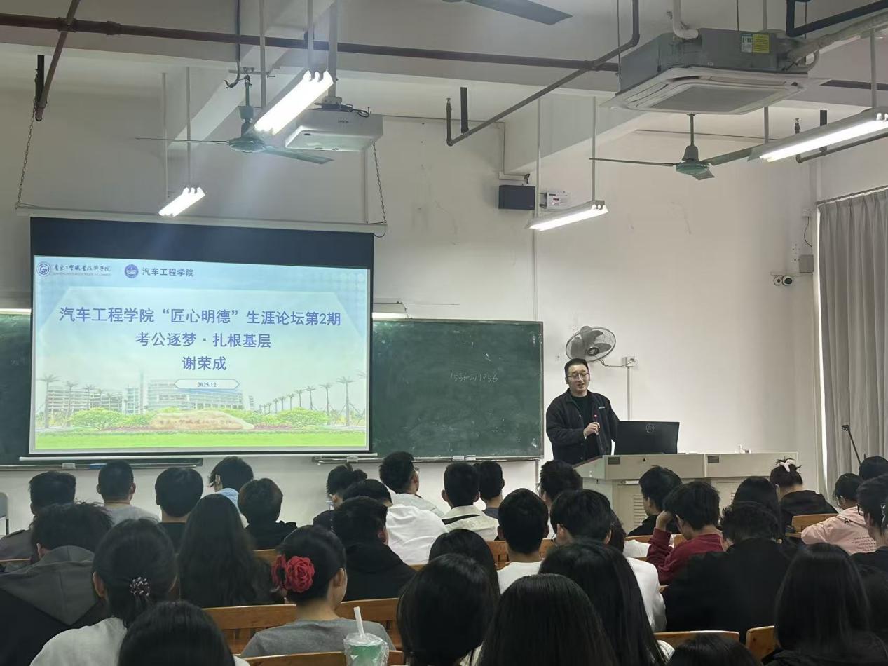 为助力学子明晰职业发展方向,搭建考公交流平台,引导青年学子投身基层建设,12月23日下午,汽车工程学院在明德楼2-302举办“匠心明德”生涯论坛第二期专题讲座。此次活动特邀汽车工程学院2018级汽车电子技术专业毕业生、现任河源市连平县城市管理和综合执法局干部、驻隆街镇龙埔村第一书记谢荣成担任主讲。本次讲座由辅导员林诺怡老师主持。