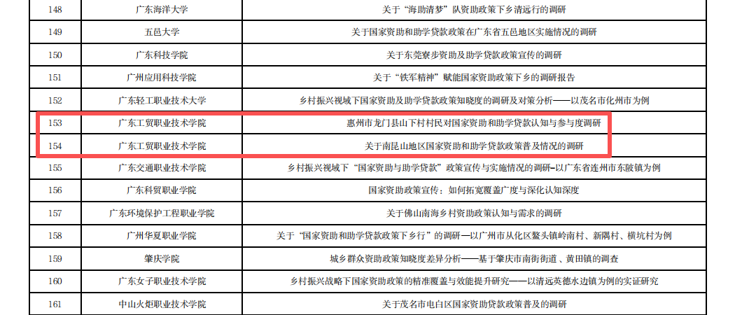 我校工商管理学院《关于广东省河源市凤安镇佛岭村国家资助和助学贷款政策知晓度与需求的调研》、经济贸易学院《惠州市龙门县山下村村民对国家资助和助学贷款认知与参与度调研》、艺术与教育学院《关于南昆山地区国家资助和助学贷款政策普及情况的调研》三篇报告获评优秀调研报告;工商管理学院谢宏祥书记、经济贸易学院章少重老师获评优秀指导老师;经济贸易学院谢湘同学、艺术与教育学院胡思情同学获评优秀实践队员。