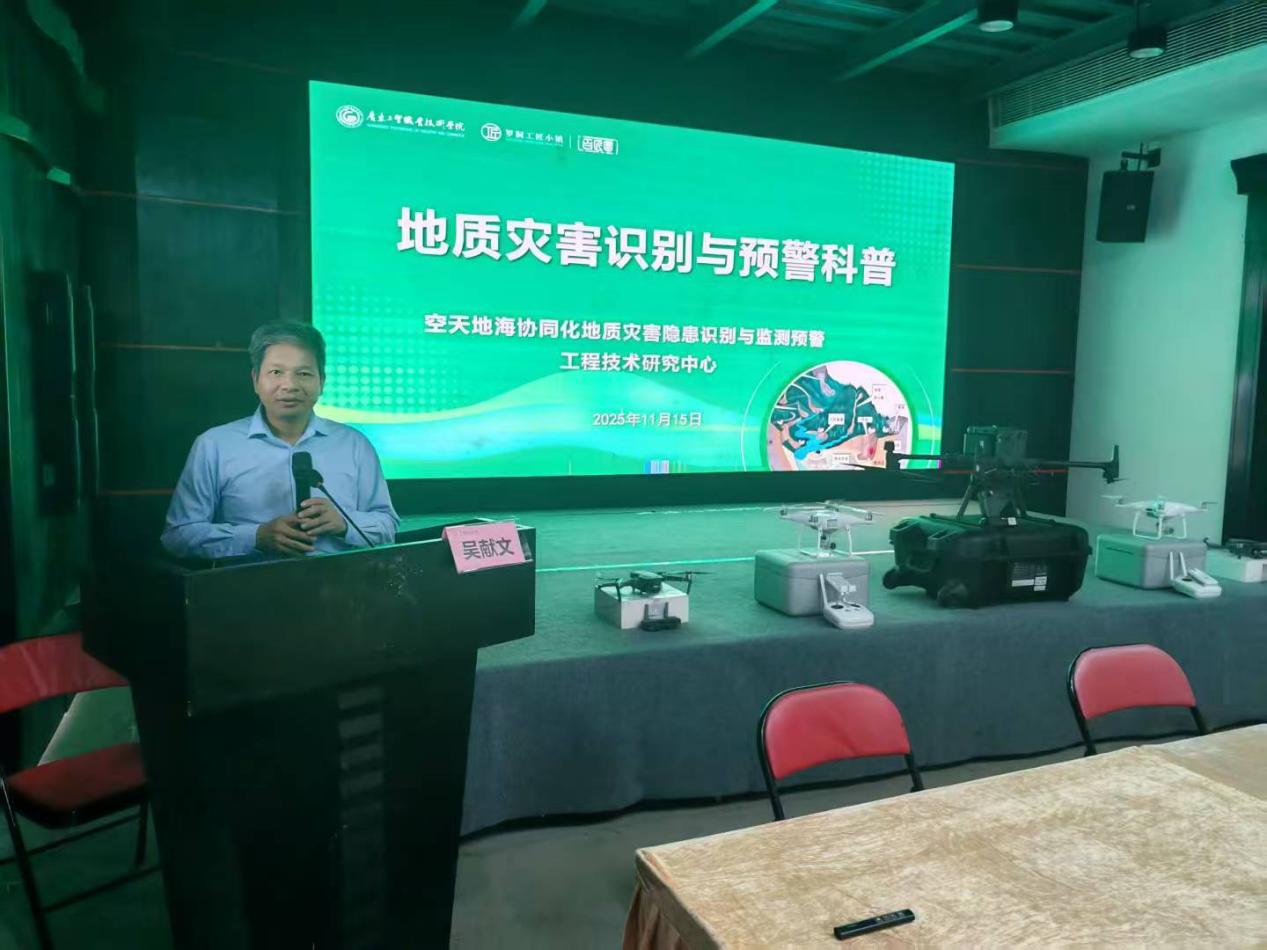 为提升公众对地质灾害的防范意识和应急处置能力,有效降低地质灾害给人民群众生命财产安全带来的风险,近日,由广东工贸职业技术学院空天地海协同化地质灾害隐患识别与监测预警工程技术研究中心主办的“地质灾害识别与预警科普公益讲座”在广州市从化区罗洞工匠小镇广乐府成功举办。来自从化区的乡村工作者、农业合作社骨干以及青年大学生参与了本次讲座。