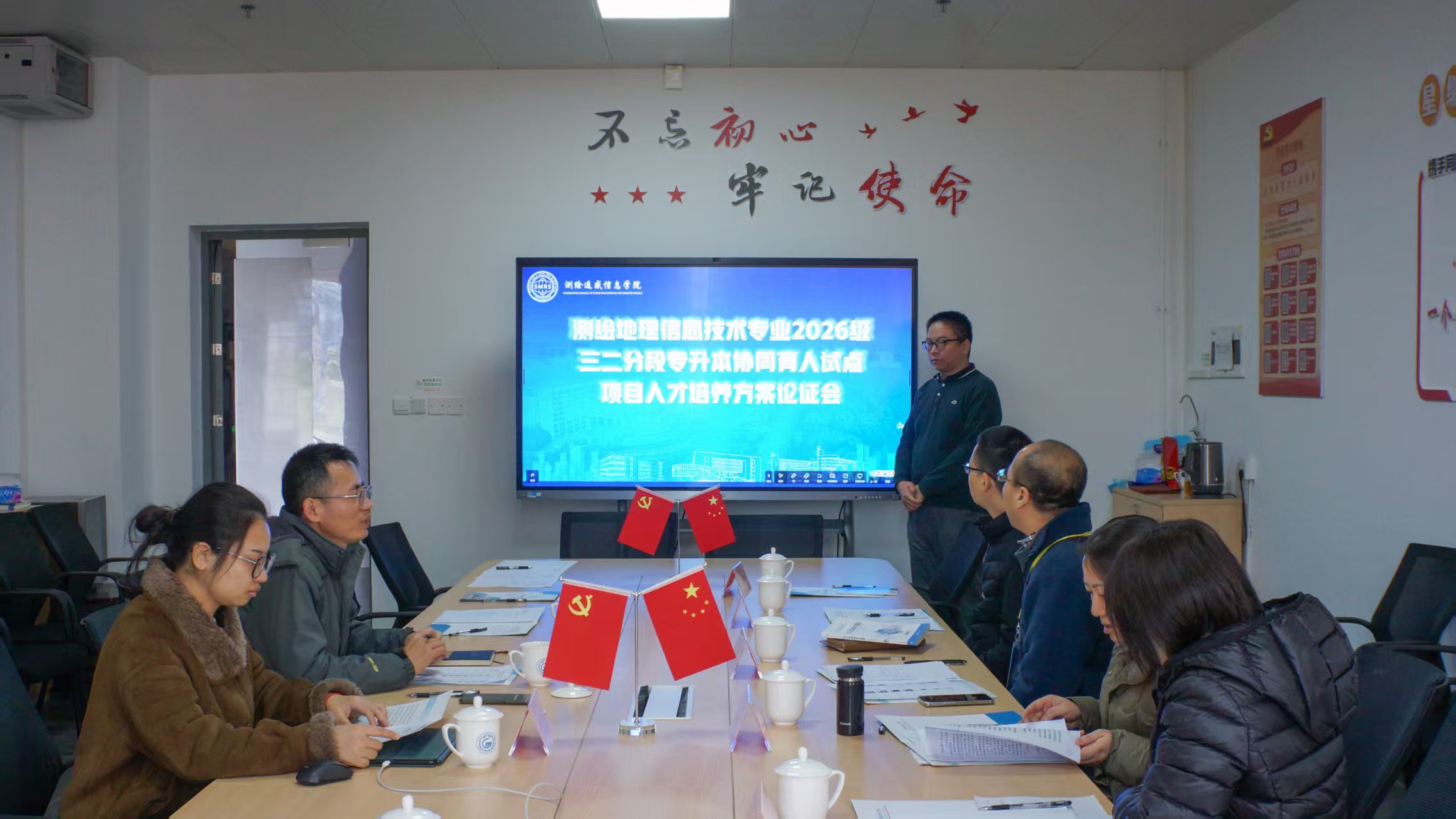 参观结束后,双方进行了座谈交流。黄铁兰首先先介绍了测绘学院在专业设置、师资、设备、课程资源和人才培养等方面的情况,然后朱腾、吴萍昊分别汇报了2026级测绘地理信息技术专业三二分段专升本协同育人试点项目的人才培养方案和转段考核方案。最后,双方对两个方案进行了充分论证和研讨。在人才培养方案方面,双方就高职和本科学段的课程设置、内容衔接、资源共建共享、学分互认和赛教融合、实习就业等议题进行了充分讨论。在转段考核方案方面,双方就转段考核课程、专业课免试条件和考核工作流程进行了认真商讨。