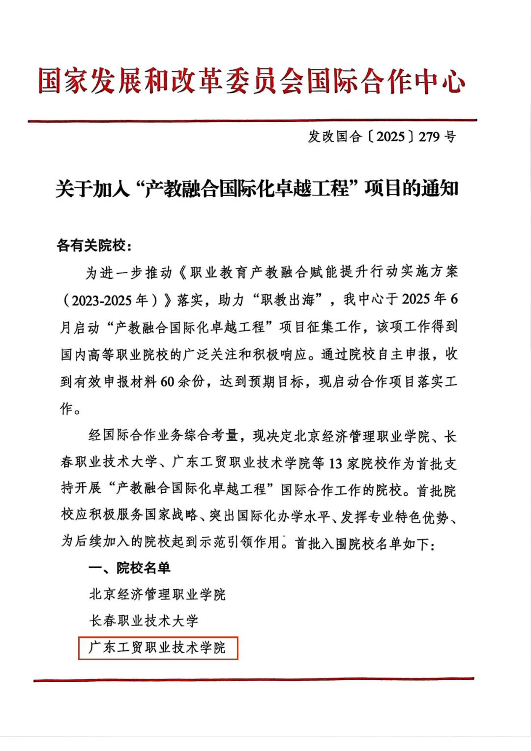 近日,广东工贸职业技术学院成功入选国家发展和改革委员会国际合作中心“产教融合国际化卓越工程”项目首批支持院校名单。