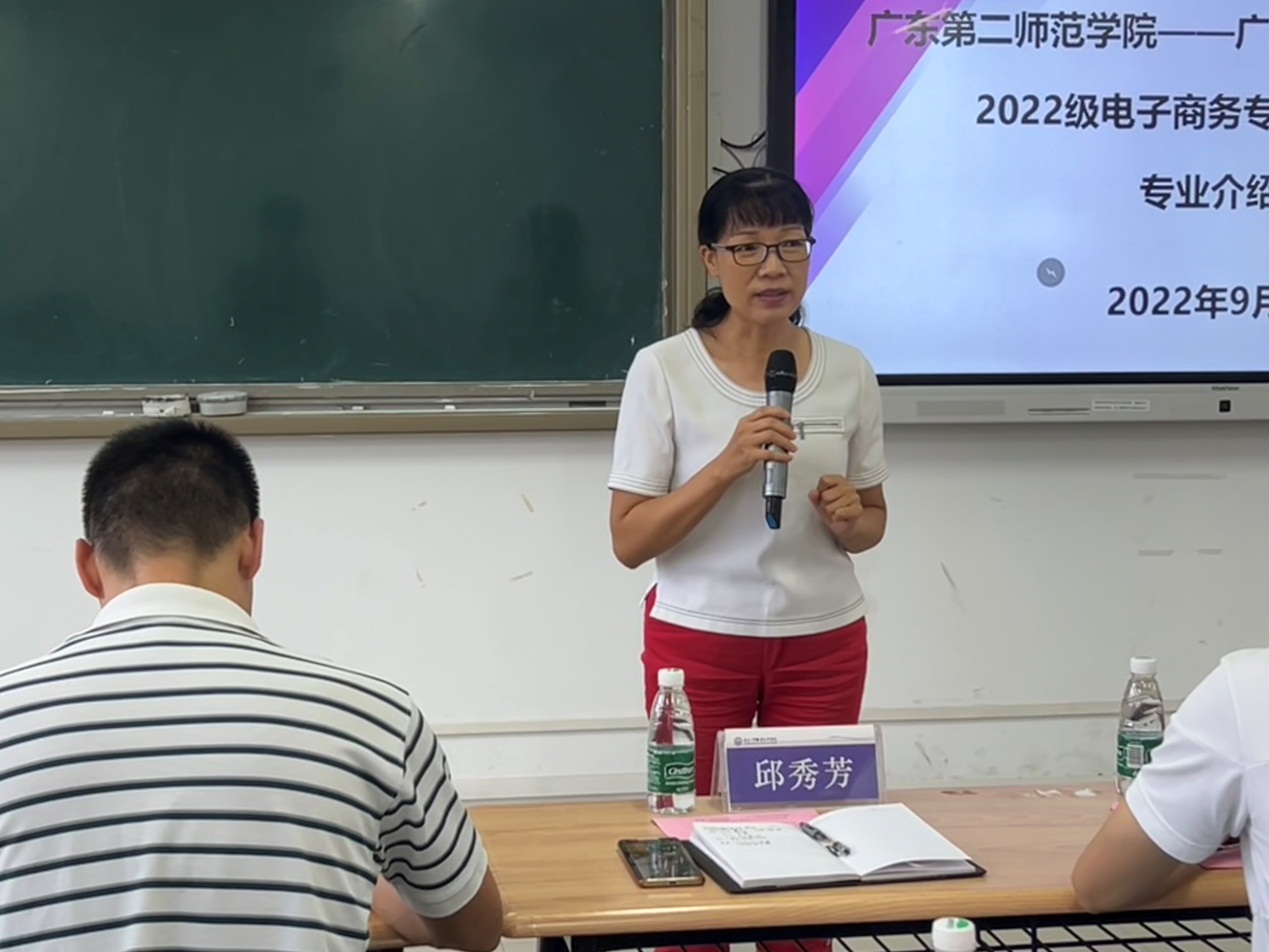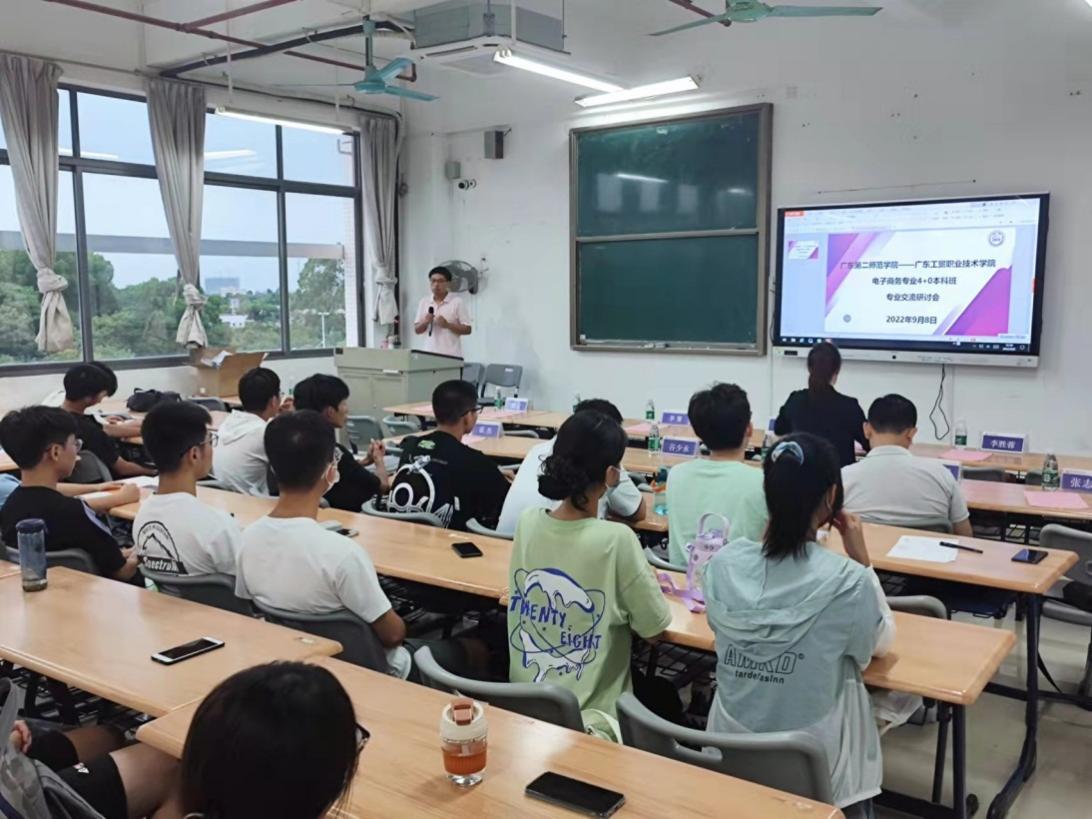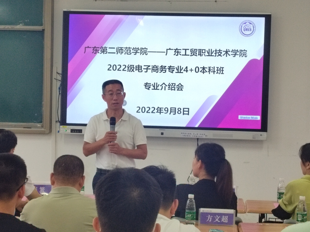9月8日下午,广东第二师范学院-广东工贸职业技术学院2022级电子商务专业4+0本科班新生专业介绍会在白云校区明德楼1-405隆重举行。广东第二师范学院管理学院副院长梅晓仁、电子商务专业系主任孙楚、教师代表李胜蓉,广东工贸职业技术学院经济贸易学院党总支书记李繁,党总支副书记、院长邱秀芳,党总支副书记龚云,副院长蒋晶,商贸系副主任谷少永,电子商务专业带头人方文超,电子商务专任教师伍炜勤及22级本科班学生参加专业介绍会议。会议由方文超主持。