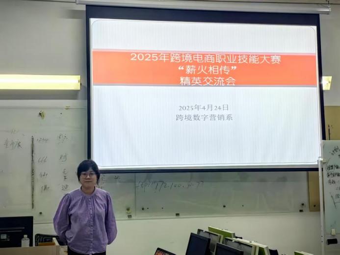 4月24日晚,经济贸易学院在实训楼508举办2025年跨境电商职业技能大赛经验分享会,50余名跨境电商专业学生参与。活动由学院学业导师余媛主持,陈建兰担任指导老师,旨在通过“朋辈传薪火”模式,助力跨境电商人才培养。