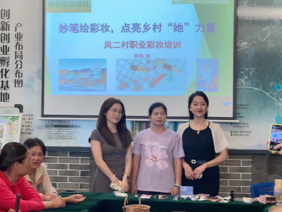 5月29日,广东工贸职业技术学院经贸学院的彩妆课堂“搬”进了广州市凤二村——一间布置着镜子、化妆刷和各色眼影盘的教室里,20余位农村中青年女性围坐在主讲老师夏瑜璟身边,跟着她的示范学习“职业妆的秘密”。这场别开生面的社区教育活动,正用“美丽技能”为乡村振兴注入“她”力量。