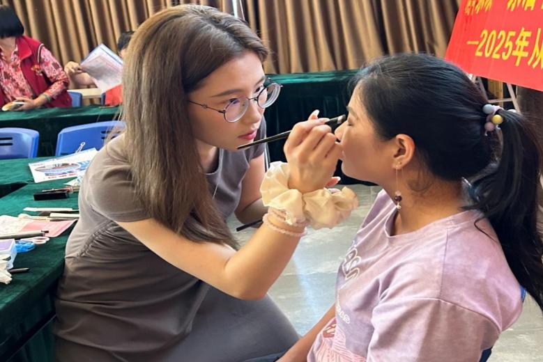 “很多农村姐妹平时只化基础妆,遇到求职、参加婚礼等场合就犯难。”项目负责人黄诗媛老师介绍,此次培训专为农村女性设计,聚焦“实用职业彩妆技能”,帮助她们提升形象管理能力,更自信地融入社会、展现价值。