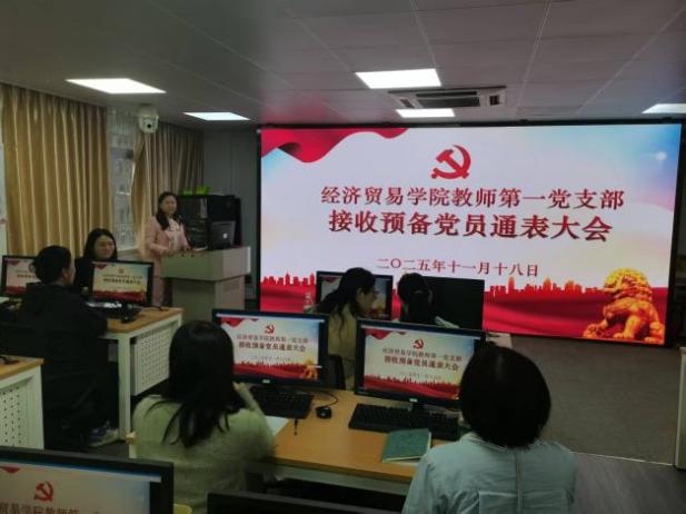 2025年11月18日下午,经济贸易学院教师第一党支部接收预备党员通表大会在天河校区实训楼202室召开。会议由党支部书记廖晓虹主持,经济贸易学院党总支书记许斯华、院长蒋晶及党支部全体党员参加。