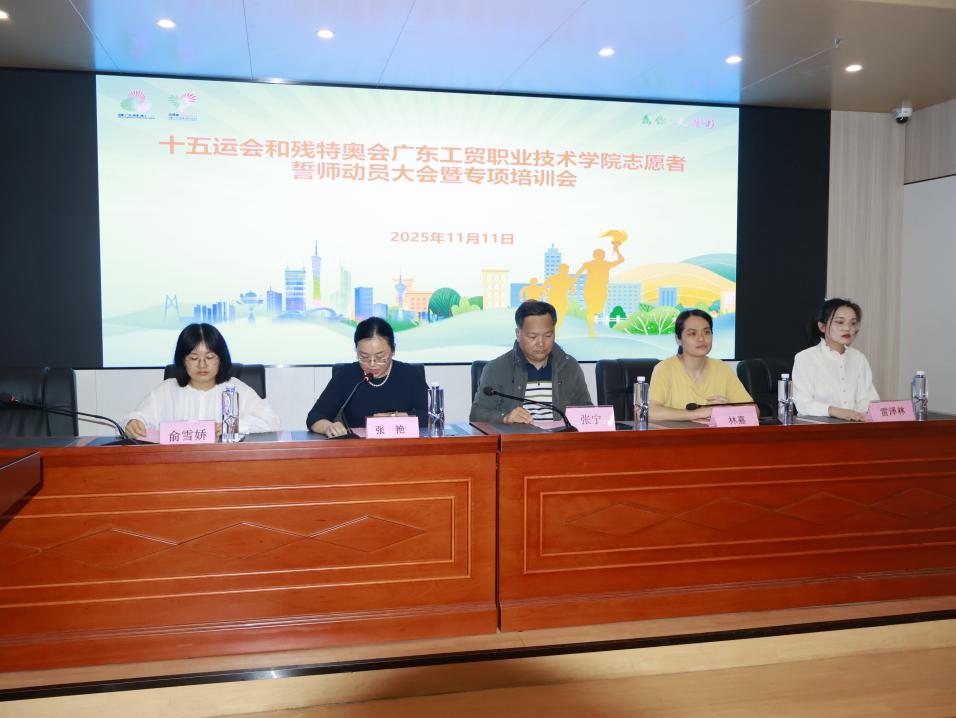 2025年11月11日,十五运会和残特奥会广东工贸职业技术学院志愿者誓师大会暨专项培训会在天河校区东区报告厅顺利举行。计算机与信息工程学院党总支书记张宁、副书记张艳,校团委办公室主任林嘉,学工办主任俞雪娇、学院青年志愿者协会指导老师雷泽林及全体辅导员出席会议。在共青团广东工贸职业技术学院委员会的指导下,学院将派出56名城市志愿者为这场体育盛会增添青春风采。
