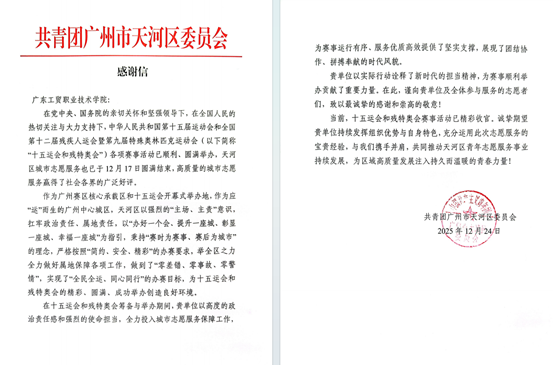 12月24日,共青团广州市天河区委员会向广东工贸职业技术学院发来感谢信,对学校在中华人民共和国第十五届运动会和全国第十二届残疾人运动会暨第九届特殊奥林匹克运动会(以下简称“十五运会和残特奥会”)期间的志愿服务保障工作予以高度赞扬,向学校及全体参与服务的城市志愿者致以诚挚感谢与崇高敬意。