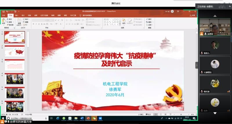 7月13日晚上20点,机电工程学院党总支副书记、院长徐勇军同志线上为机电工程学院党总支第34期入党积极分子党课培训班学员讲授了一堂以“疫情防控孕育伟大‘抗疫精神’及时代启示”为专题的党课。