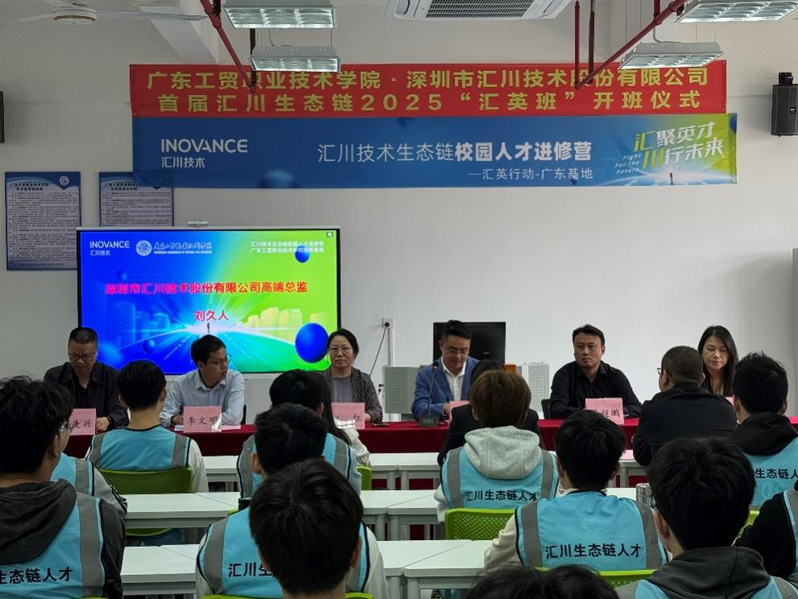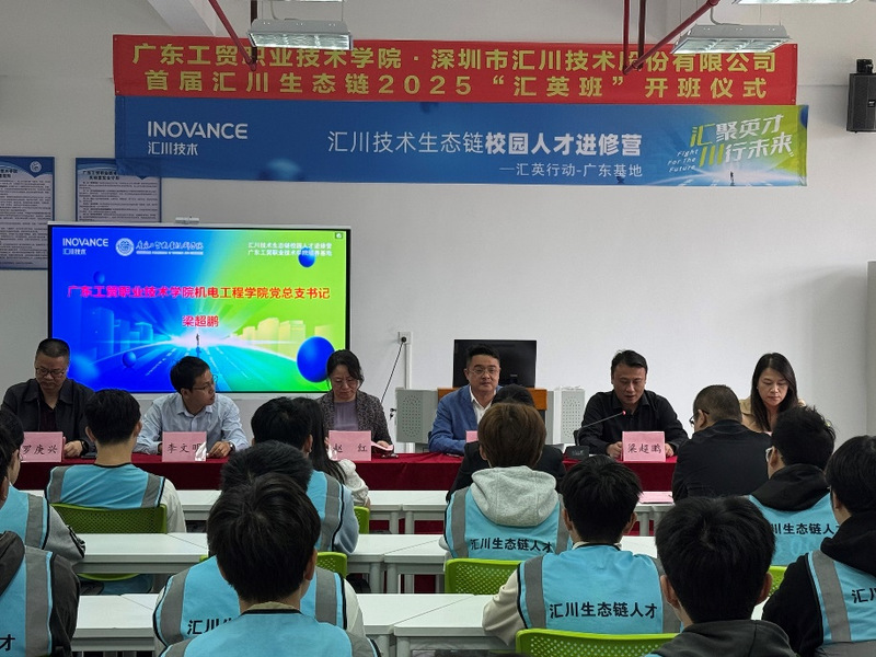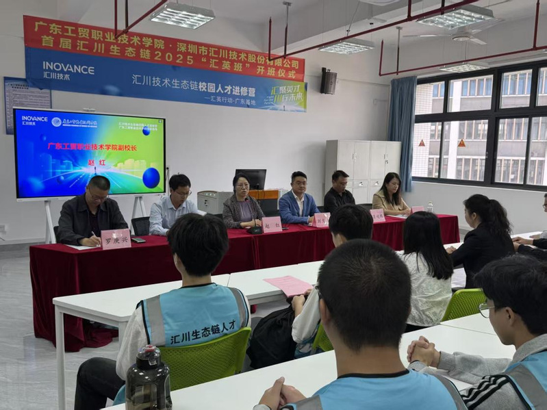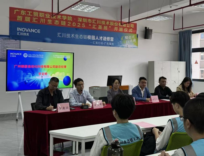 金秋送爽、丹桂飘香,10月24日广东工贸职业技术学院白云校区致知楼403室内气氛热烈,机电工程学院与深圳市汇川技术股份有限公司携手打造的汇川生态链2025年“汇英班”开班仪式在此举行。广东工贸职业技术学院副校长赵红、深圳市汇川技术股份有限公司高端总监刘久人、广州朗豪自动化科技有限公司副总经理李文明、机电工程学院党总支书记梁超鹏、机电工程学院院长罗庚兴、汽车工程学院党总支副书记欧敏和“汇英班”全体师生济济一堂,共同见证这一深化校企合作的重要时刻。在罗庚兴的主持下,仪式拉开帷幕。