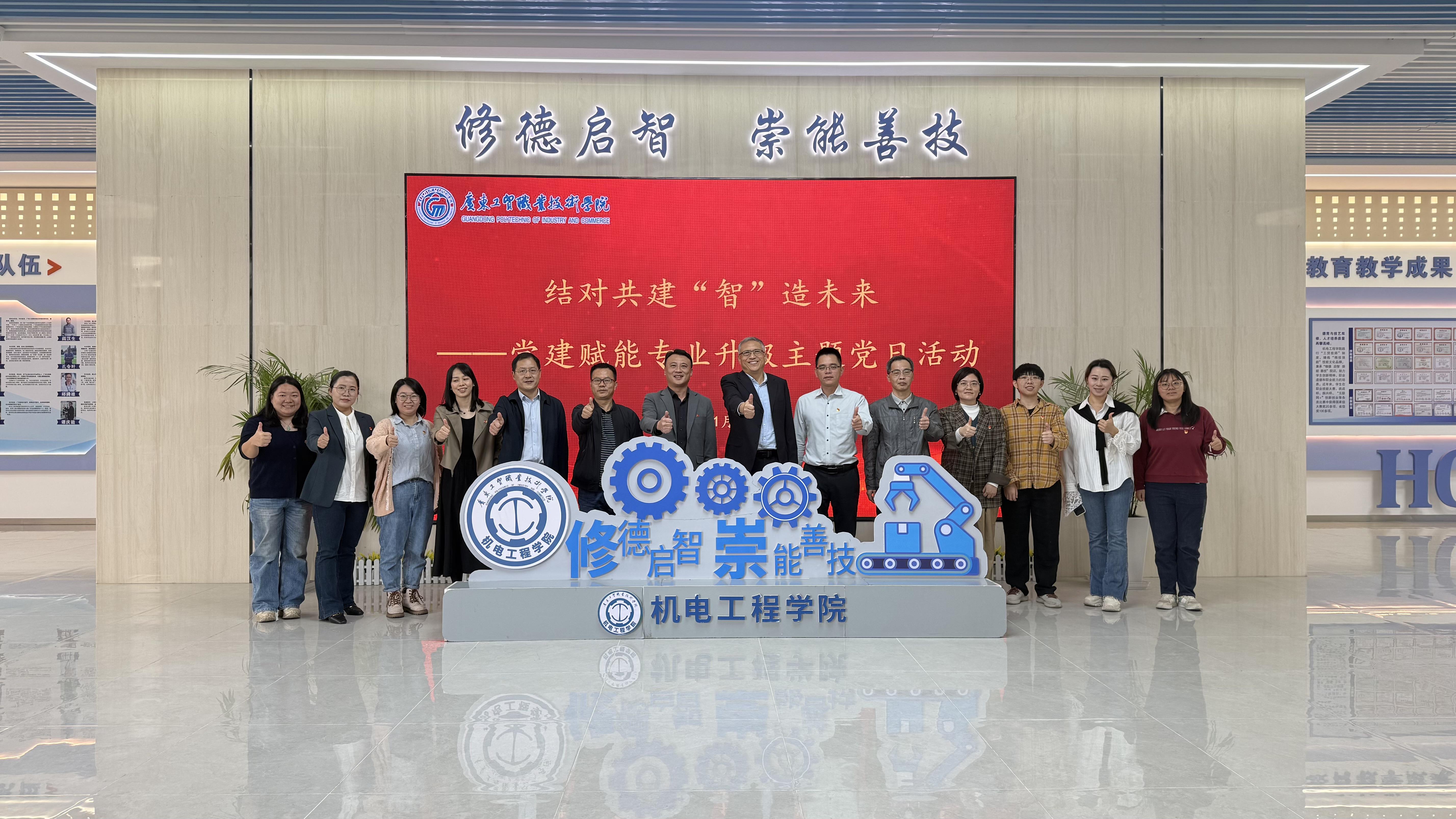 根据省委教育工委关于开展公办高校与民办高校党建和思想政治工作结对共建工作的部署要求,11月14日,广州现代信息工程职业技术学院智能制造学院院长庄继东、智能制造学院党总支副书记苏润基等一行7人莅临机电工程学院开展结对共建交流,共过结对共建“智”造未来——党建赋能专业升级主题党日。组织宣传统战部部长杨慧、机电工程学院党总支书记梁超鹏及机电工程学院相关人员参加了活动。