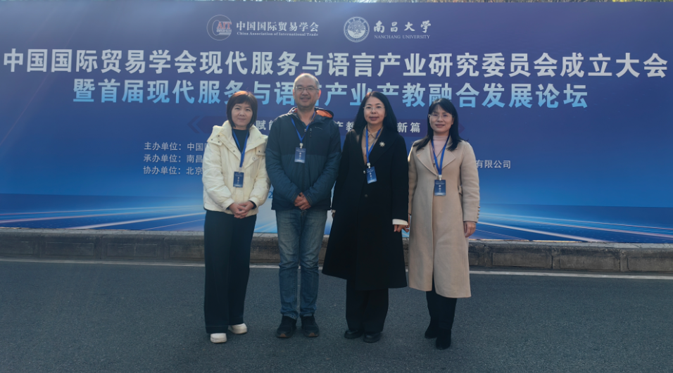 12月27日至29日,由中国国际贸易学会主办的首届现代服务与语言产业产教融合发展论坛在江西南昌隆重举行。论坛汇聚了全国教育界、产业界代表,共同探索产教融合新路径,推动现代服务与语言产业协同创新发展。应用外语学院院长彭枚芳率队参加本次论坛,副院长胡红玲、苏俊懿以及产教融合办公室主任王燕玲一同参会及开展校际调研。