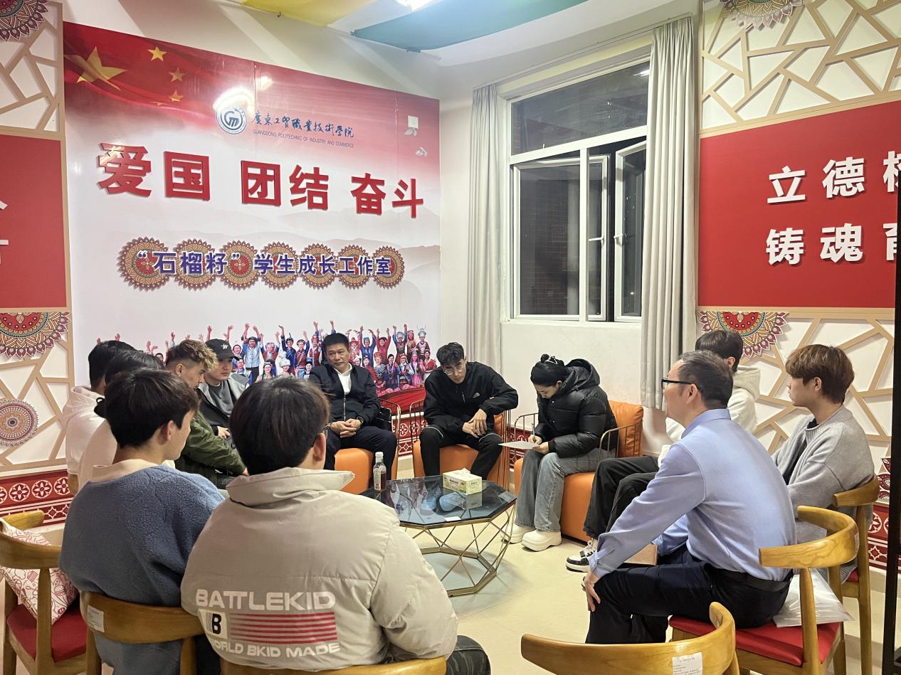 为深入学习贯彻党的二十届三中全会精神,深化推进民族团结进步宣教活动,铸牢中华民族共同体意识,促进民族学生交流交往交融和全面发展。2024年12月17日,学校党委委员、副校长唐毓秋到白云校区“石榴籽”学生成长工作室与工作室主持人、辅导员及民族学生代表开展“践行社会主义核心价值观 做新时代“四有”好青年”主题座谈活动。