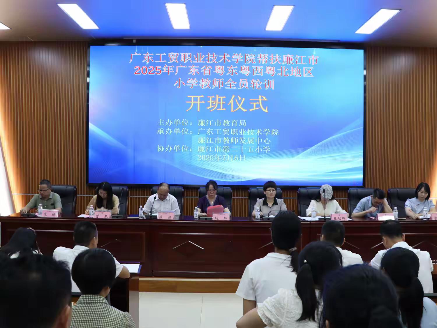 为深入贯彻落实省委、省政府关于全口径全方位融入式帮扶粤东西北地区基础教育高质量发展的决策部署,广东工贸职业技术学院(以下简称“我校”)持续深化与廉江市的对口帮扶合作。2025年7月6日上午,由我校与廉江市教师发展中心联合举办的“2025年粤东西北小学教师全员轮训项目”开班仪式在廉江市顺利举行。学校副校长赵红携艺术与教育学院院长张幼晖、党政办公室副主任曾竞、培训与继续教育学院干事古玥等一行出席仪式,出席人员还有廉江市委教育工委专职副书记、市教育局党组成员吴小梅,廉江市教育局人事股股长徐景年,廉江市教师发展中心党支部书记、主任陈强,廉江市第二十五小学校长廖琦等。开班仪式由廉江市教师发展中心书记、主任陈强主持。