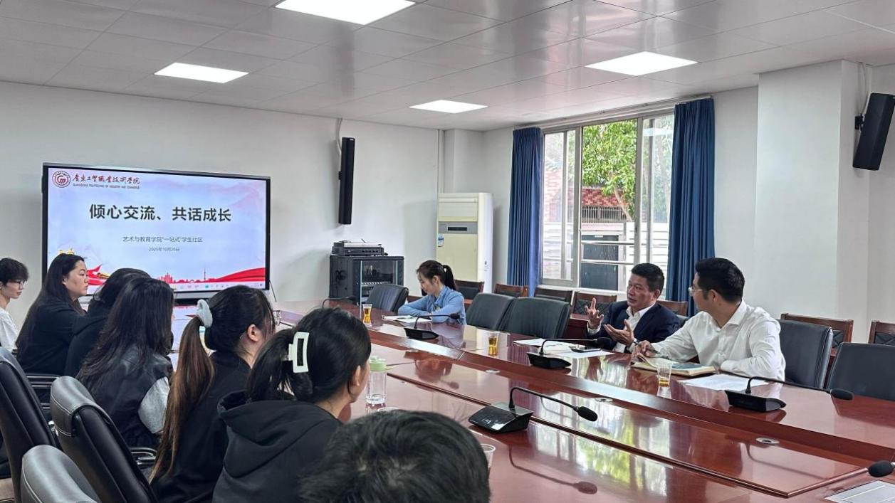 为深入贯彻落实党的二十大精神和《教育部思想政治工作司关于开展“一站式”学生社区综合管理模式建设试点工作的通知》要求,扎实推进高校思想政治教育工作,2025年10月26日,学校党委委员、副校长唐毓秋走进荔湾校区开展“一站式”学生社区建设专题座谈会,艺术与教育学院党总支副书记代启兵、辅导员韩靓以及学生代表参加了座谈。