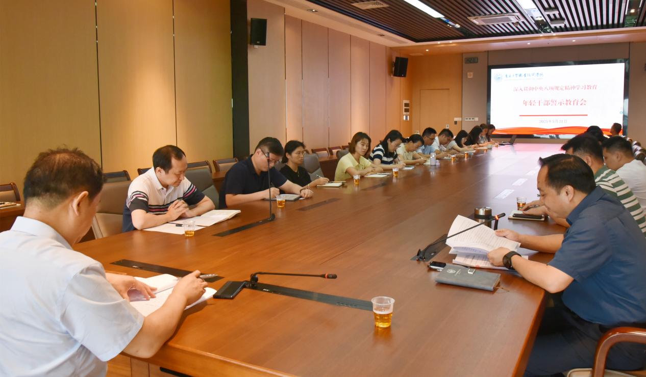 为深入贯彻中央八项规定精神学习教育,5月21日下午,学校在白云校区博学楼1-628会议室召开年轻干部警示教育会,党委书记何汉武,党委副书记揭英荣,党委委员、纪委书记陈斌,学校年轻干部参加会议。会议由揭英荣主持。